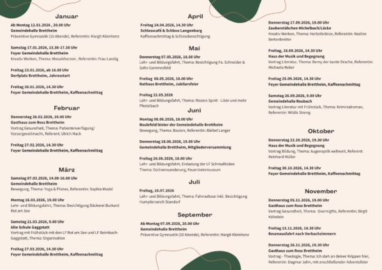 Außerdem werden all unsere Veranstaltungen und Neuigkeiten im Gemeindeblatt Rot am See, im Schaukasten am EDEKA Brettheim, in unserer WhatsApp-Gruppe und auf Instagram veröffentlicht.