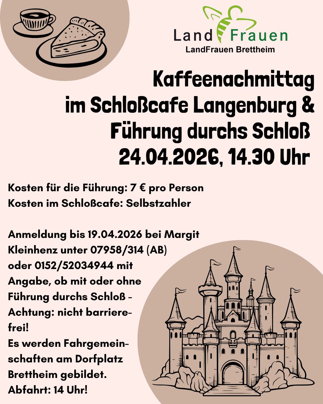 Wir bitten um Anmeldung bis 19.04.2026 bei Margit Kleinhenz unter 07958/314 (Anrufbeantworter) oder 0152/52034944 mit Angabe, ob mit oder ohne Führung durchs Schloß.